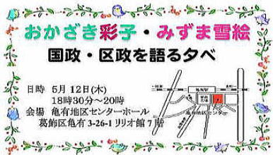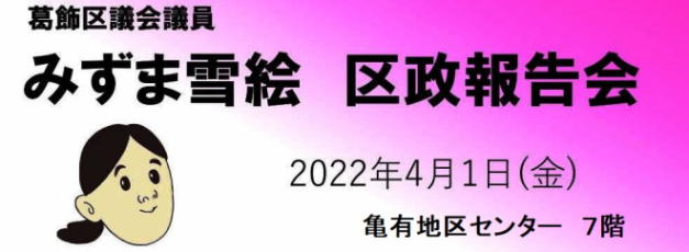 日時 2022年2月18日(金) 18時30分~20時終了予定 場所 亀有地区センターホール 葛飾区議選に立候補していた【みずま雪絵】は2695票33位(定数40)で当選しました。